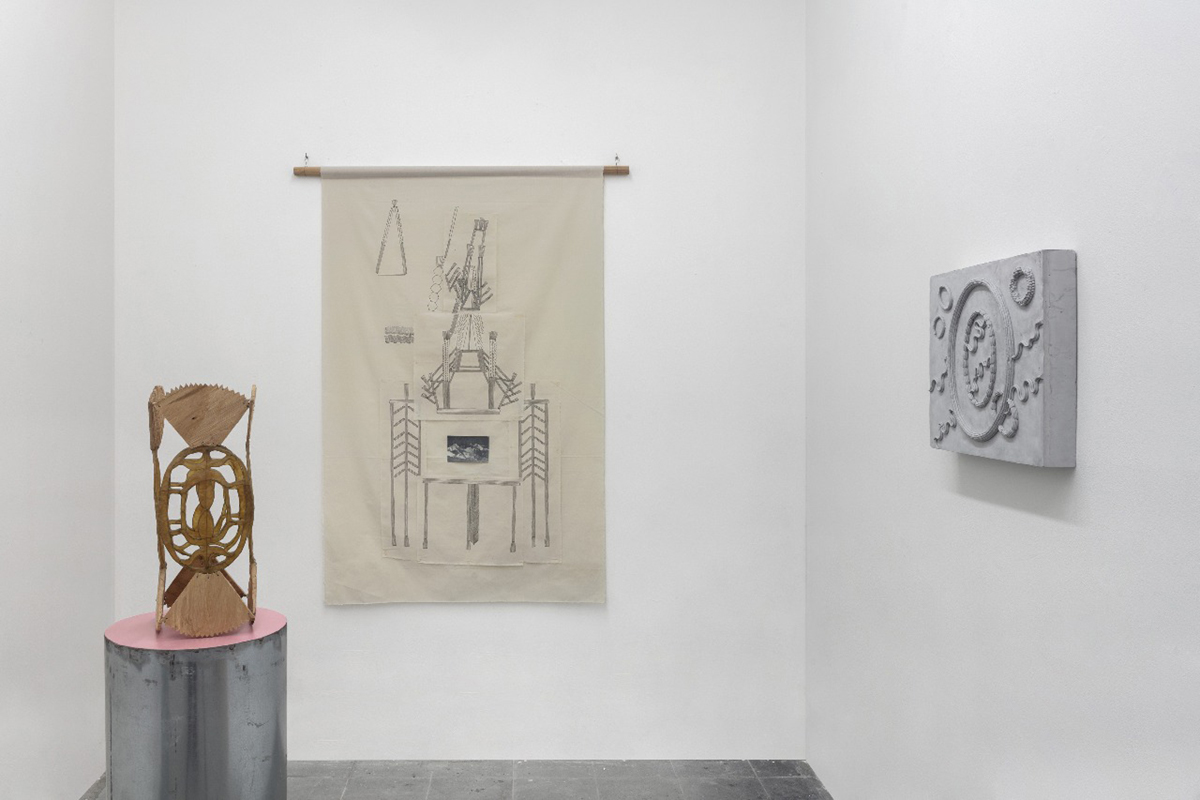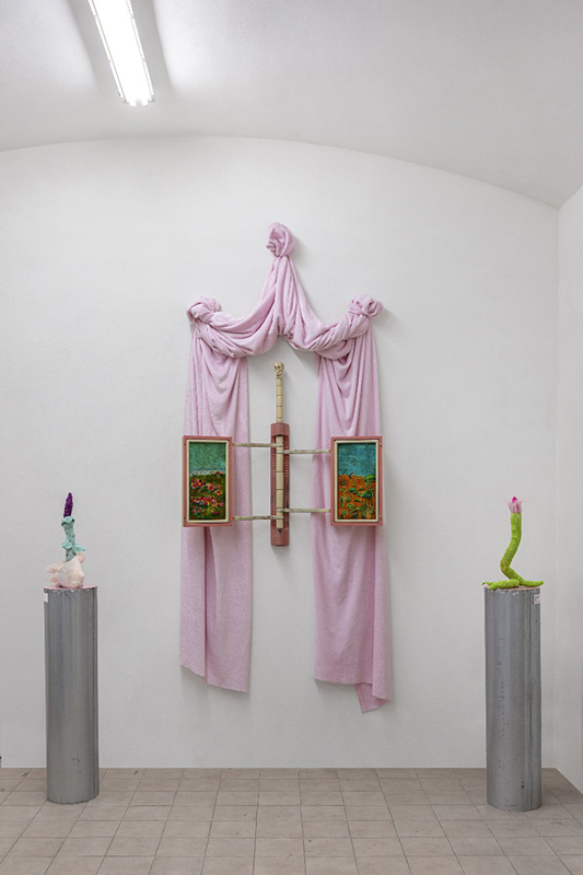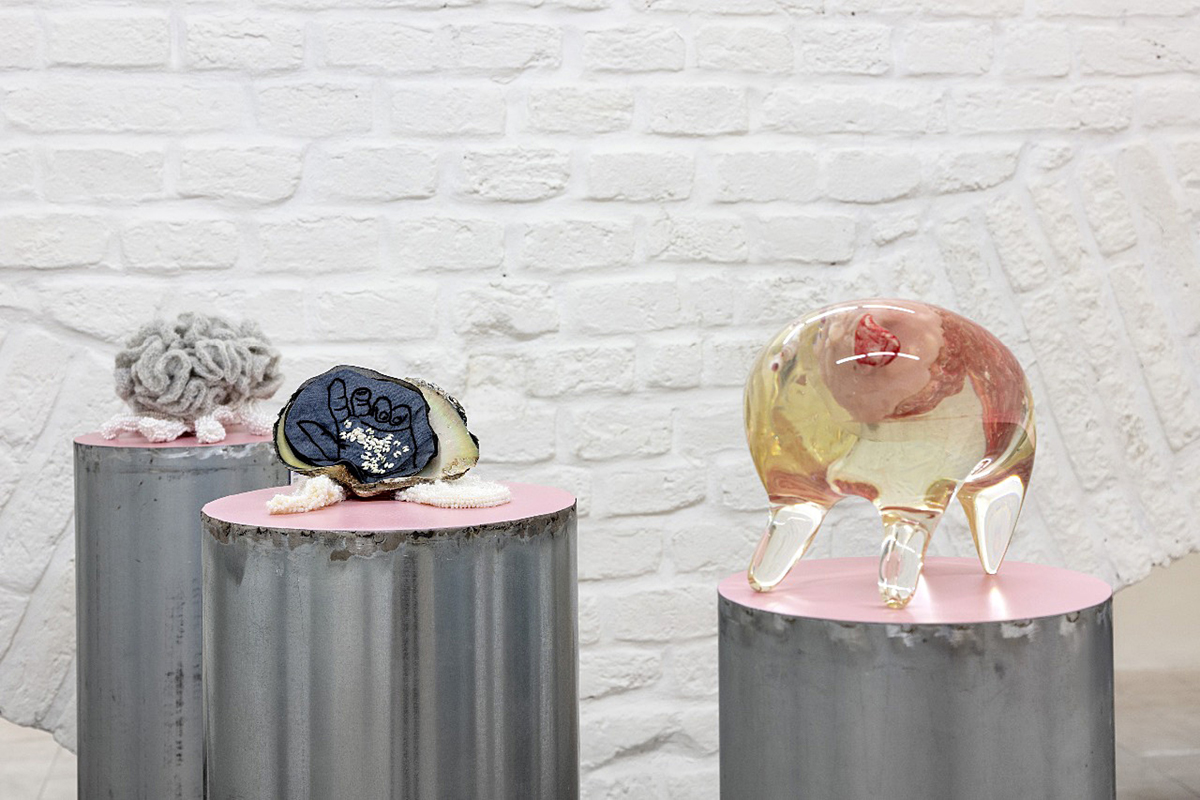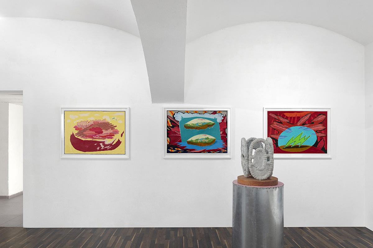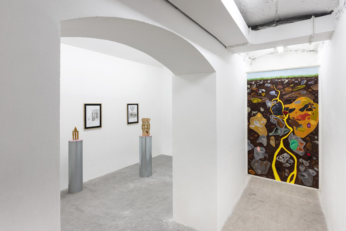 Z výstavy Soft Borders v pražské Nové galerii: v pozadí dílo ze souboru Sweet and Sour Karímy Al-Mukhtarové, vpředu Kolektivní vědomí Matěje Hrbka, foto: Nová galerie Barbora Vovsová (* 1991) se pohybuje na pomezí organičnosti a umělého řádu. Objekty často vytváří z pestré směsi materiálů, ovšem jako významově „pestřejší“ mi přišly její kresby/koláže, v nichž kombinuje jednoduché ornamenty s realisticky nakreslenými skálami a horninami.