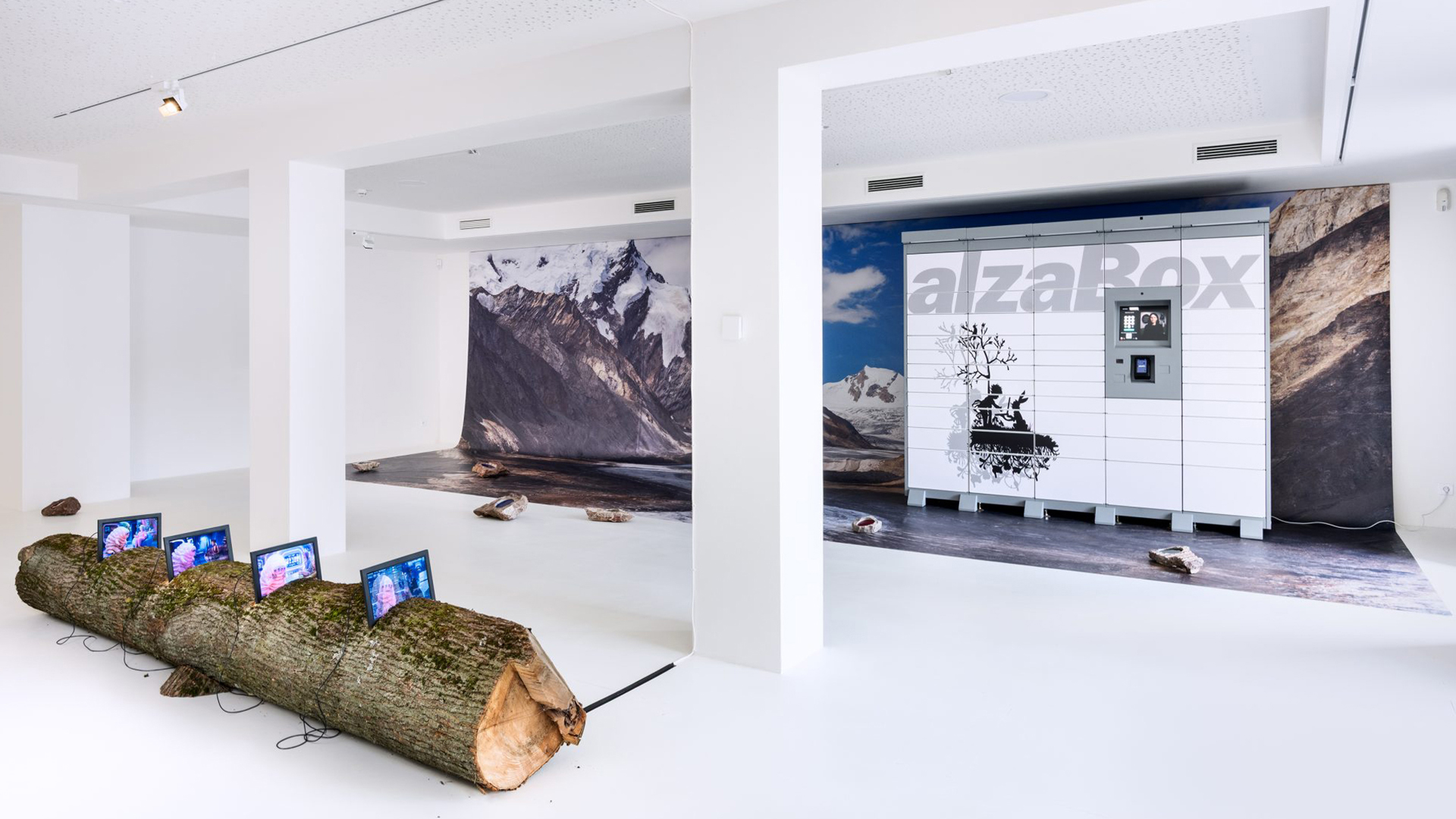 S čím máme ještě problém? S politickými influencery? Nechme tedy namluvit herce na kameru vábivé řeči, které vás obalamutí. A kamery umístěme na malé stolečky-ostrůvky odkazující na ostrovy utopie. Protože – jak dnes víme – v jádru každé utopie byla nebezpečná propaganda. Ten kontrast! To se bude líbit. A není snad výdejní Alzabox dalším symptomem spotřeby a ztráty pracovních míst v přepážkách na poště, kde se pod tlakem naštvaných zákazníků tak skvěle pracovalo? Šup s Alzaboxem do výstavy, a nechme ho nedobytně vibrovat a dunět. Ještěže máme ve sluchátkách audio průvodce od autorů…