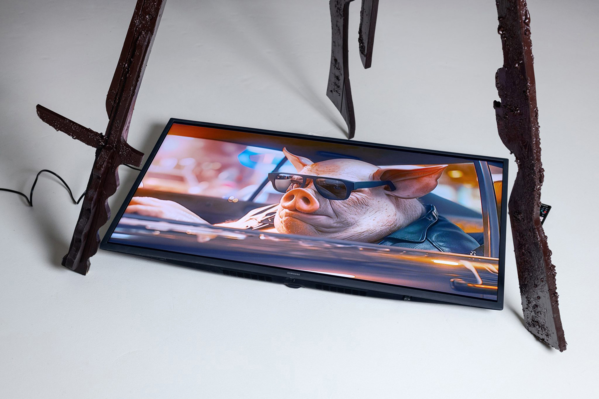 První místnost je jakoby pekelná. Na orezlých stojanech stojí monitory a ukazují výjevy odlidštěné blízké budoucnosti, které vyrobila umělá inteligence. Nic, co byste neviděli při sledování jakýchkoliv jiných AI videí, která zaplavují dnešek. Na místě by byla spíše kritika samotného média než jeho nenápadité užití. Ještě frapantnější to je v případě filmu v další místnosti, který – ano – opět dodala AI, teď ovšem již očividně poněkud staršího modelu. Obsah videa? Paní v blízké budoucnosti revoltuje tím, že věci recykluje, namísto aby si kupovala nové. Společnost spotřeby krutě demaskována!