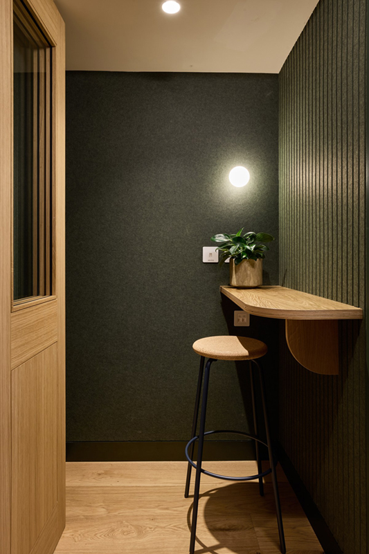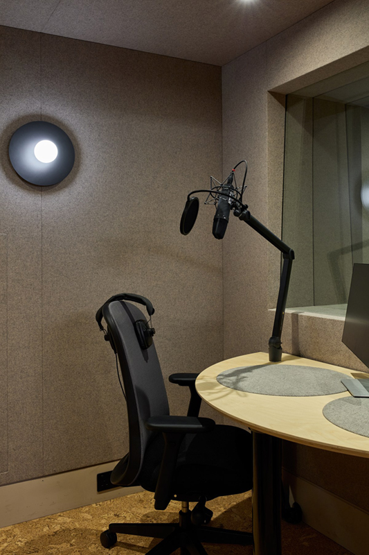 Chtěla jsem navíc prostory pojmout i více rezidenčně, žádné sterilní kancelářské prostředí. Tmavě zelená a olivová barva dominují prvnímu až třetímu patru. Použili jsme spoustu vlněných závěsů, které mají i druhotnou akustickou funkci. Mimo specializované audio místnosti a studia, kde se upravují filmy, jsme na každém patře vytvořili flexibilní prostory, kam si člověk může sednout sám, nebo se může sejít s kolegy. Pokojové rostliny jsme umístili na všech patrech.
