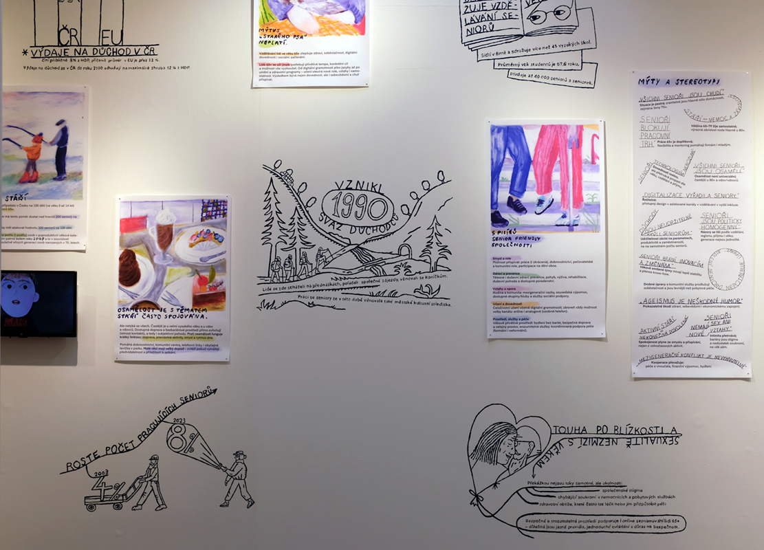 Pohled do expozice Co čumíš tak mladě: výstava o stáří jako inspiraci, která je do začátku jara příštího roku instalována v pražském Atriu Žižkov, foto: Štěpán Mikulenka Součástí expozice je i edukační materiál ve formě pracovního listu; dostupný je každému návštěvníkovi, cílený je především na děti. Jeho součástí jsou tipy na aktivity a odkazy na knihy a filmy jak pro seniory, tak pro mladší generace. Projekt Co čumíš tak mladě se zabývá náročným a těžko uchopitelným tématem – kdo se ještě stáří nedožil, nemůže je plně pochopit, a kdo je již starý, nemůže zcela porozumět současnému světu mladších generací. Téma osamocenosti seniorů, které výstavou prostupuje, je nepopiratelným společenským problémem, jenž není možné přehlížet. Ale pokud v reálu o sebe staří a mladí navzájem nejeví zájem, zůstanou osamocené obě strany a programy neziskových spolků jim v tom pomohou zřídkakdy. Aktivity těch spolků smysl samozřejmě mají, ale je třeba si říct jaký a pro koho. Jako brána k mezigeneračního dialogu mohou totiž fungovat jen mezi lidmi, kteří mají vůli jej začít.