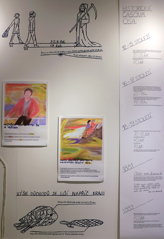 Rozsáhlou plochu prostoru využívá umělkyně Nikola Logosová. Ta své ilustrace kombinuje s fakty týkajícími se důchodců. Práce funguje spíše jako archiv faktografických informací obohacený ilustracemi. Zeď s tímto dílem je zároveň doplněna obrazovkami s animacemi, jež vznikly v rámci mezigeneračních dílen spolku Elpida.