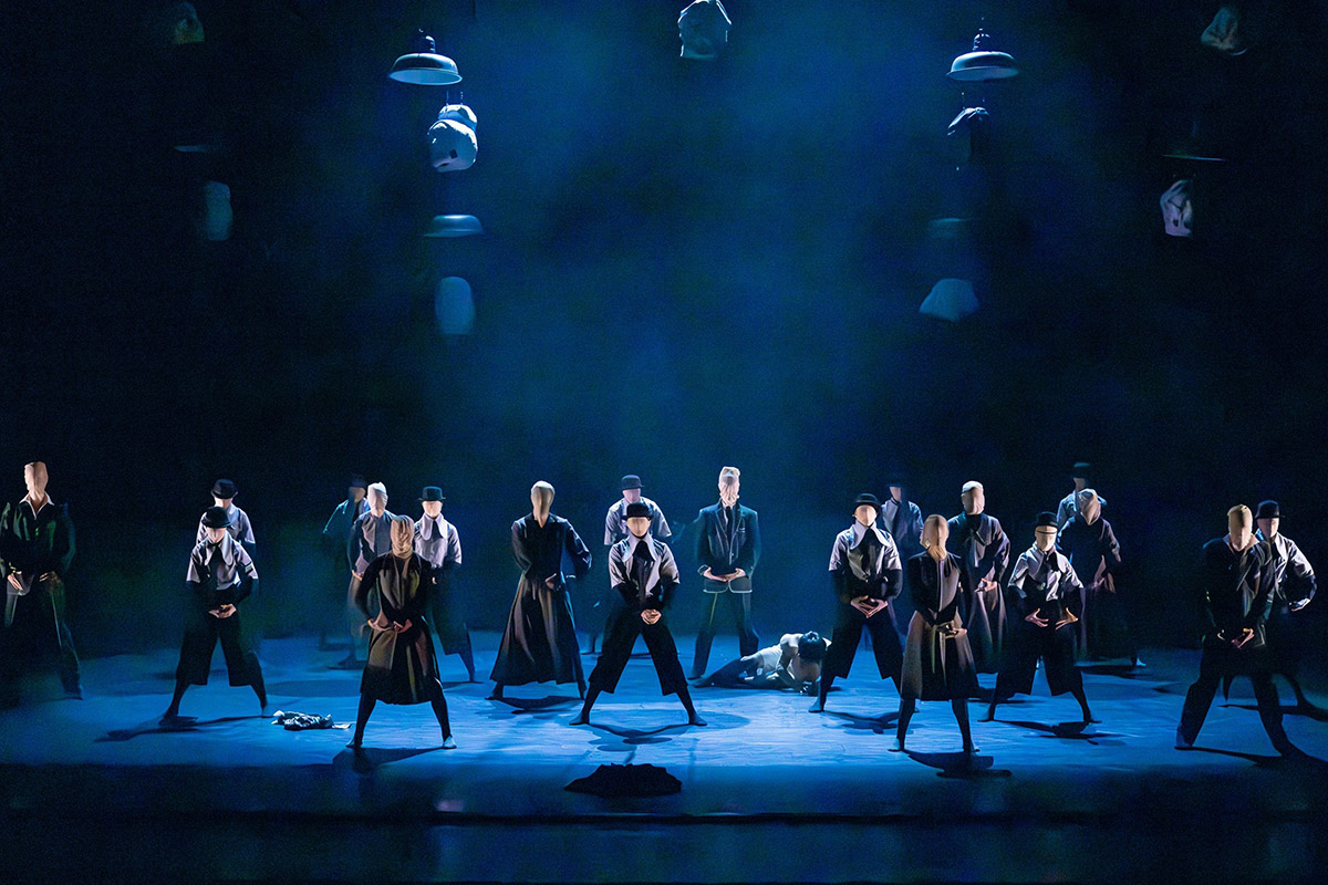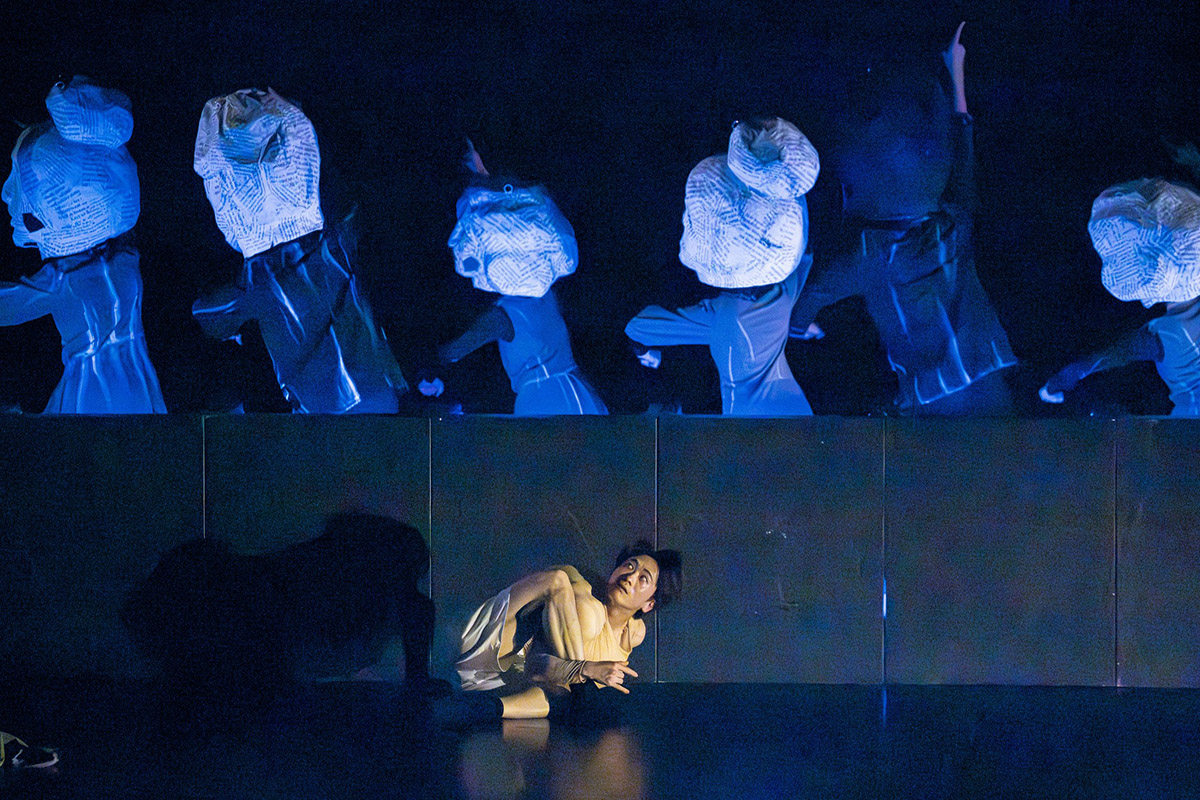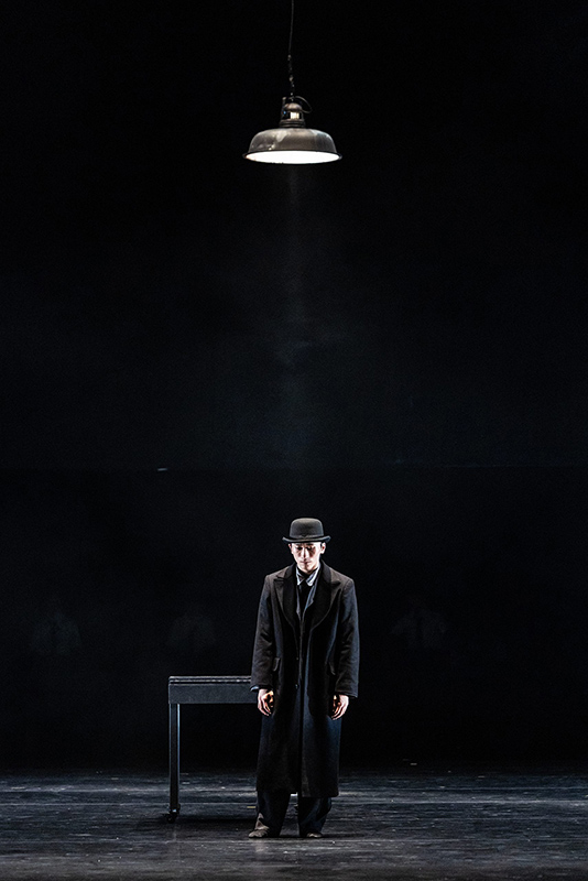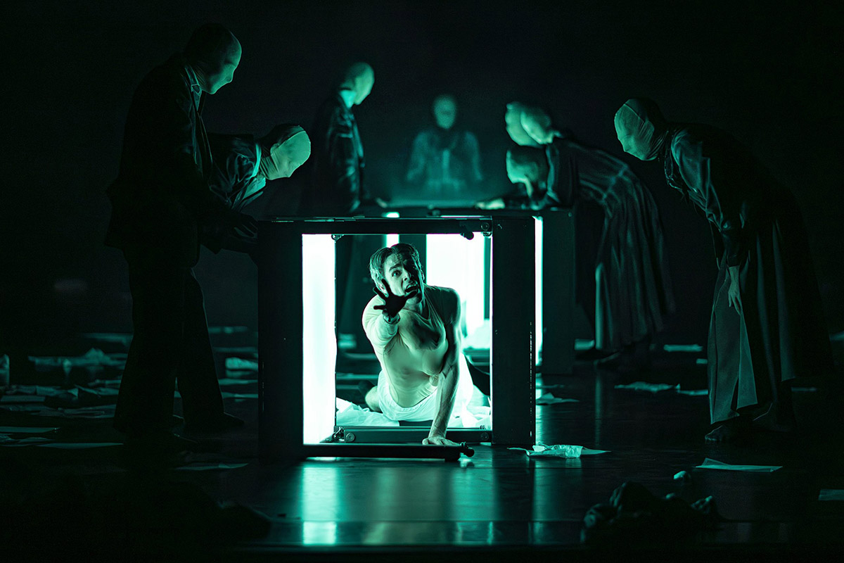 Sólista Arthur Abram sedí na rampě – s povislými rameny, v šedém obleku, s buřinkou na hlavě; jako bychom měli před sebou samotného Kafku s jeho pobledlou tváří a výraznýma očima, s uhlazenými tmavými vlasy. Pomalu vstává, pronikavý, smutný pohled směřuje do obecenstva a nadzvedá oponu, jež vypadá jako šedá oprýskaná zeď. Na jevišti stojí sbor, nad ním visí velké černé lampy, do jejichž světelných výsečí tanečníci vstupují. Hra o životě, hra o život začíná.