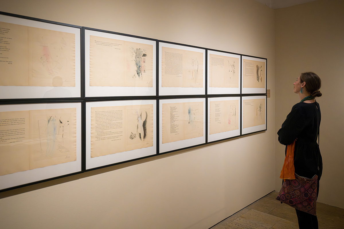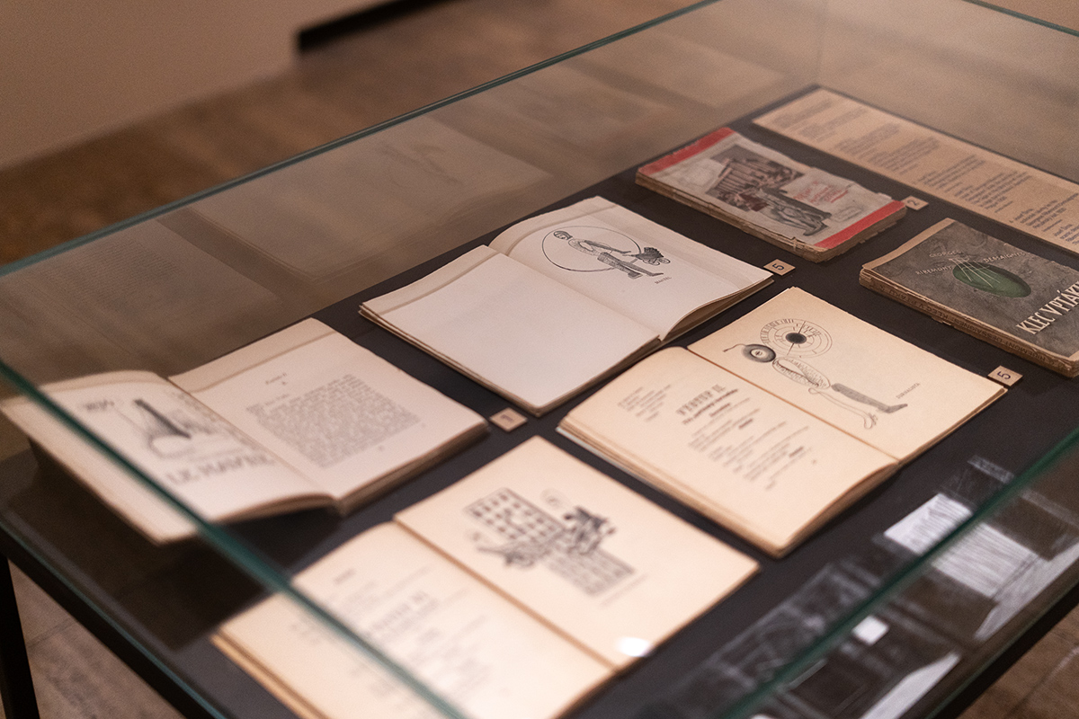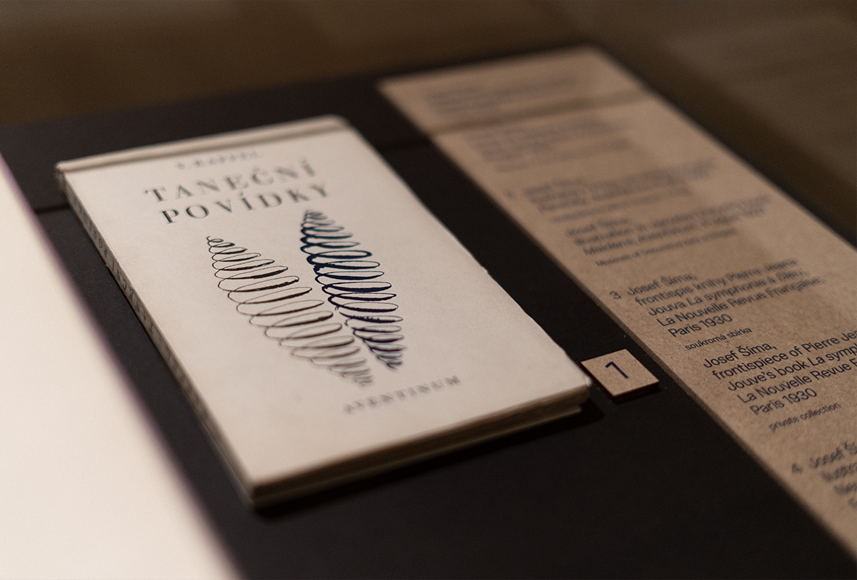 Na samém konci hlavní galerijní lodi se nachází velká mapa Paříže označující místa, kde se Šíma pohyboval. Můžeme si tak udělat obrázek o tom, jak blízko to měl ze svého bytu do ateliéru nebo kde se uskutečnila jeho první pařížská výstava. Další místnosti pak tematizují to, jak umělce ovlivnilo setkání s ruským lingvistou Romanem Jakobsonem v první polovině dvacátých let. K vidění tu rovněž jsou listy z alba Paříž i další tiskoviny – ilustrace, dopisy či Teigeho poznámky k Šímově tvorbě. Zaujal mě i komiks Kůň Pu, který Šíma v roce 1928 kreslil pro Lidové noviny (jde o originály, texty jsou tak psané ručně pod komiksovými políčky). Dokonale jednoduchá je Šímova kresba na obálce knihy Vladimra Raffela Taneční povídky (rovněž 1928) a k vidění je i samotný výtisk.