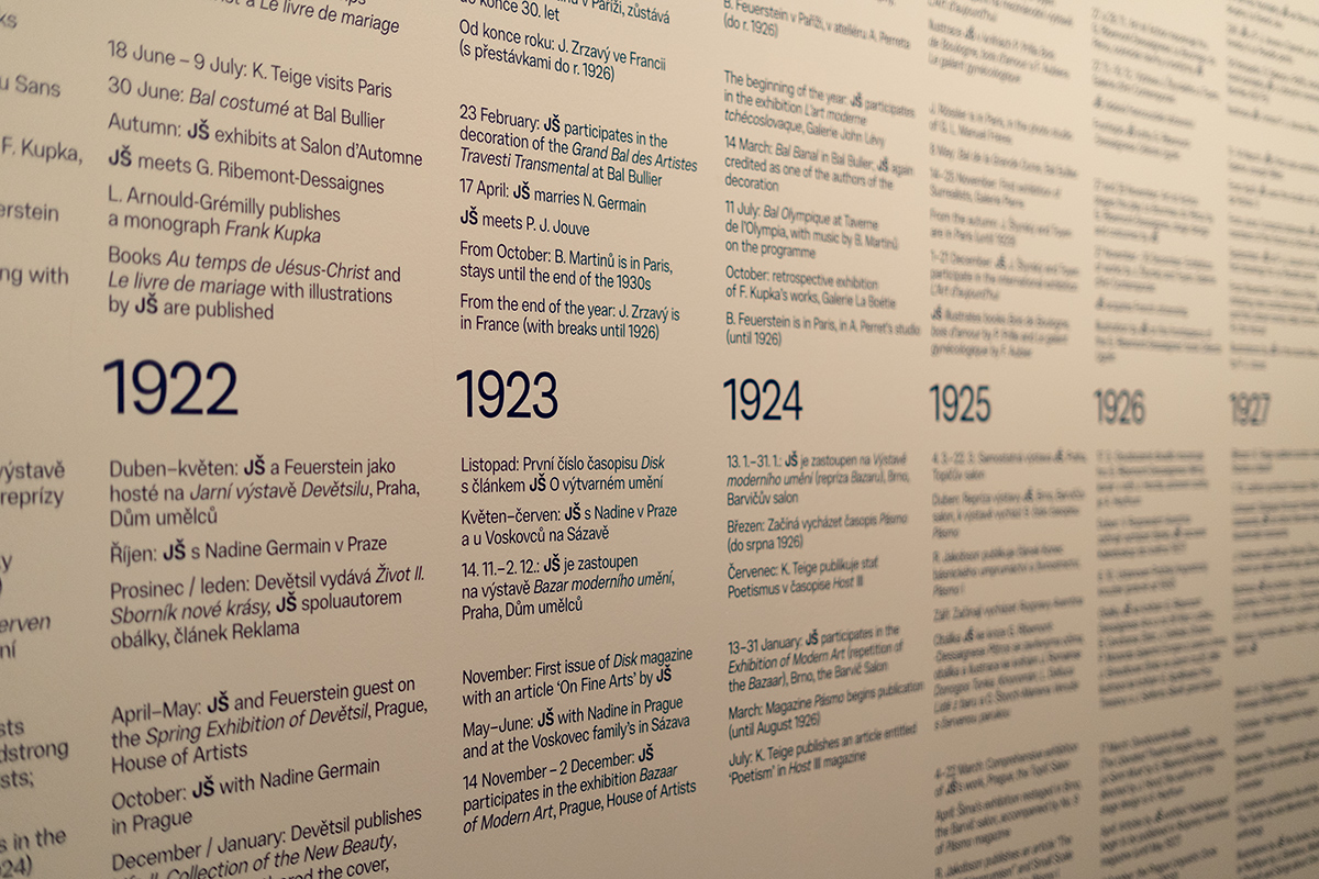 Součástí úvodních partií instalace je rovněž docela vyčerpávající seznam datumů a událostí (začínající rokem 1919), které se děly v Praze a v Paříži. Souzním s tím, že obzvlášť u výstav tohoto charakteru je kontext tvorby umělce a doby, v níž se pohyboval, potřebný. Pokud by se však našla i divácky stravitelnější možnost, jak časové a místopisné souvislosti předat, výstavě by to jedině pomohlo. Protože v tomto výčtu paradoxně i kontextu jeho kontext poněkud schází. Navíc je návštěvník rovnou zahlcen písmeny a čísly – aniž dostal možnost vidět nějaké Šímovo dílo.