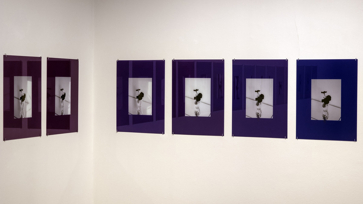 Jak tomu bohužel v kurátorských textech mnohdy bývá, tak z formulací, které by publiku měly poskytnout základní orientaci, nabídnout mu výchozí bod, neboť právě i takovou „výpomoc“ Brousilova sekvence vyžaduje, návštěvník naopak nebývá o nic moudřejší. Mám takový intelektuální deficit, že nejsem s to kurátorský text pobrat, anebo je to jen zašmodrchaně napsané? – tohle na vás doléhá u nejedné výstavy. A tak i zde. Reálně na stěnách AJS vidíte řadu černobílých výškových fotografií květiny (mimochodem: pro vyznění je zcela lhostejné, na jaký přístroj byla surfinie exponována), každá je vytištěna na skle určitého barevného odstínu, ten odstín tvoří jakousi paspartu kolem zvětšeniny. Každý záběr vznikl za jiných světelných podmínek, při procházení podél té řady sledujete proměnu zátiší, jeho atmosféry, vnímáte hru světelných konstelací. Nabýváte dojmu, že časosběrným intervalem nejspíš byla plus minus byla jedna hodina. Dojem běhu času a proměň v něm posilují barevné odstíny paspart: postupně evokují ranní rozžíhání přes polední kulminaci k podvečernímu stmívání až noční tmu tmoucí, kdy zátiší jen tušíme. Ale znamená to – pokoušíme-li se současně brát v potaz a rozklíčovat text kurátora Gajduška –, že s časosběrností je nakládáno „jen jako“? Že posloupnost je pouze simulována a linearita záznamu je popřena (když je slovy kurátora oněch pětadvacet exponátů „zároveň nepravidelně rozloženo do dvanácti barevných odstínů – šesti náležejících do spektra dne a šesti do spektra noci“)??
