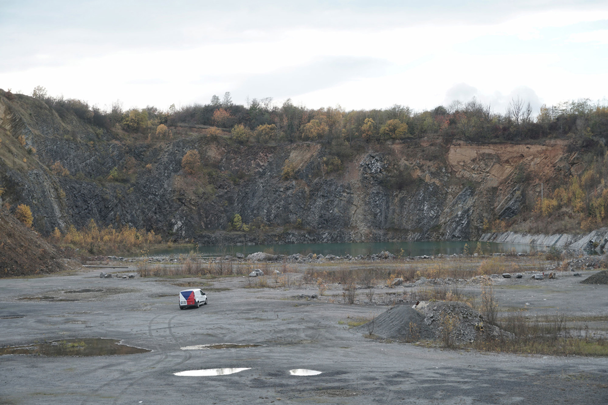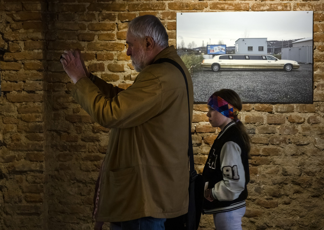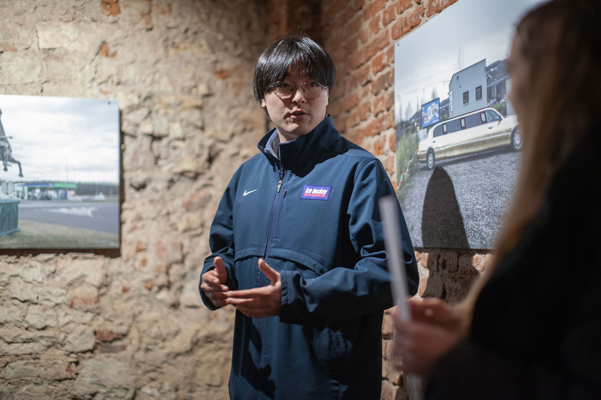 Začněme nejmladším autorem z dnešní trojice. Yutong Xie (* 1999), původem z Číny, předloni absolvoval magisterské studium v Ateliéru dokumentárních strategií na pražské FAMU. Živí se jako fotograf a kameraman. V Galerii Fotografic dává nahlédnout do svého cyklu Czech Landscape čili Česká krajina. Yutong Xie křížem krážem jezdí po Česku a pozorně se dívá kolem sebe: pozoruje města i venkov, krajinu otevřenou i městskou, všímá si surreálných konstelací. Kupříkladu procovské zlaté limuzíny parkující uprostřed šedivé poloprůmyslvé zástavby kdesi na periferii. Nebo objektiv zacílí tak, aby bylo patrné, že jakési sídliště bylo vystavěno pouhých pár set metrů od těžbou „ohlodané“ kamenné masy. Automobilová dodávka s českou vlajkou na zádech si to bůhvíproč štrikuje nehostinnou, asi příměstskou scenérií s jezírkem a skálami. Lamí farma našla své v areálu továrny.