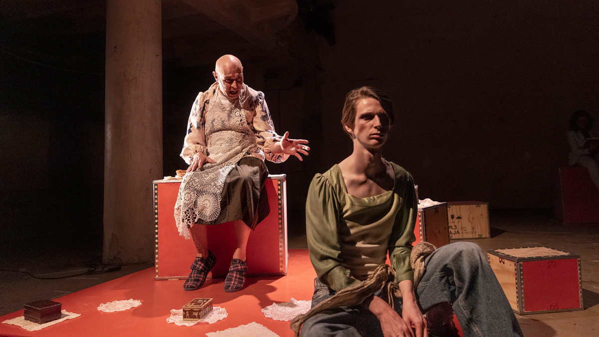 Přesto je těch zhruba sto minut hraných bez pauzy inscenačně akceptovatelných. Zejména díky hereckému kvartetu Vojtěch Hrabák, Lucie Roznětínská, Hynek Chmelař a Matěj Šíma – všichni jmenovaní patří k jádru uskupení, které v X10 tvoří, mají se syrovým podzemním prostorem i s poetikou a tématy této scény už své zkušenosti a Ondřej Štefaňák (* 1997) zde nerežíruje poprvé. Hrabák ztělesňuje hlavní, nebinární postavu vzpomínající na svoji rodinu, na svoji matku (Roznětínská), otce (Šíma) i babičku, zde řečenou grosméri (Chmelař); a po celou dobu se ve vertikálním látkovém útvaru, odkazujícím na strom (jeden z motivů vyprávění), nachází se svými elektronickými nástroji Vojta Líba a hudebně dění podkresluje a umocňuje. Že se hraje o jinakosti, o moci jazyka a zraňování slovy je patrné od prvních minut, ale v hereckých projevech nic není hnáno do ostentativní exprese, natož pitvoření se. Hynek Chmelař působí v roli vypravěččiny babičky natolik samozřejmě, že za chvíli jeho „protiobsazení“ nevnímáte. Vojtěch Hrabák činí nebinaritu své postavy velmi lidskou a rozehrává bohatou výrazovou škálu: křehkost, pocity vyloučenosti a nepatřičnosti, stavy smutku, napruženosti, rozčileného spílání. Vypravěč dokáže být velmi jemný a křehký, také ovšem úsečný, ostrý, sebestředný.