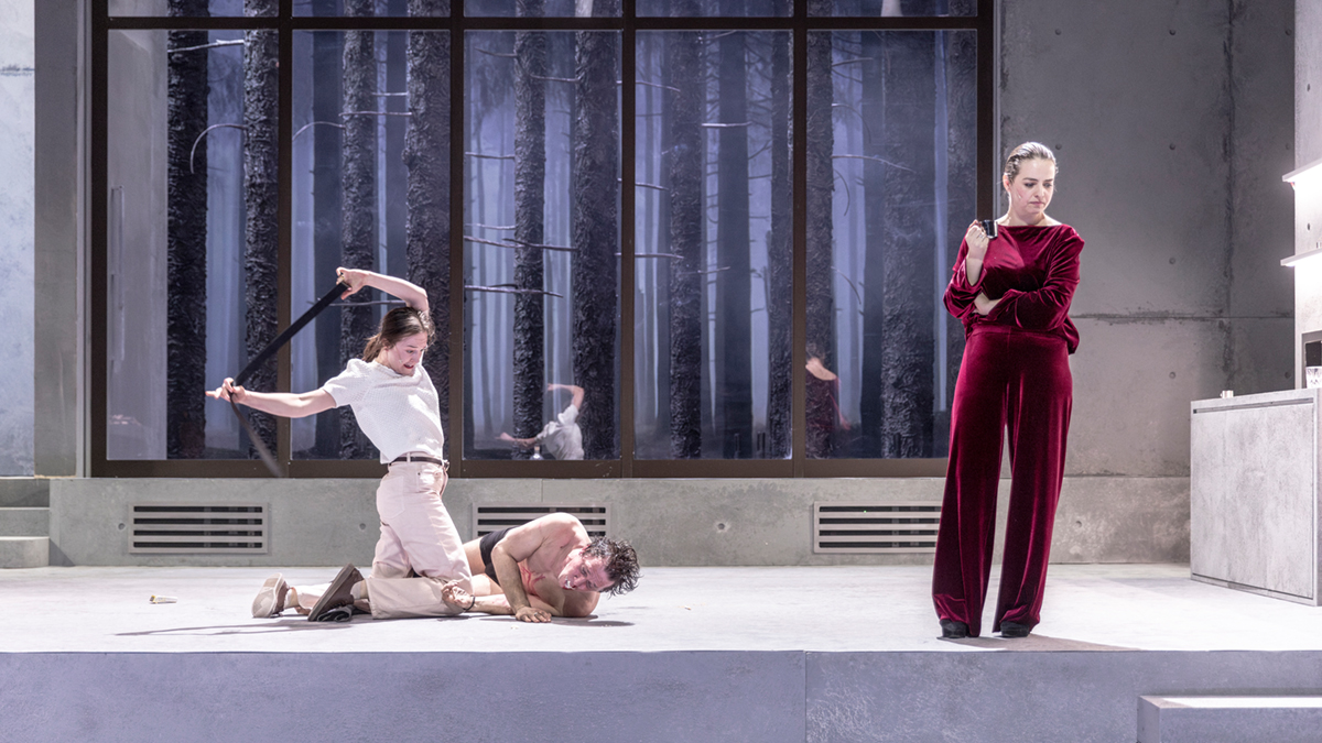 Heda a Jørgen se přestěhovali do nového domu v Holmenkollenu, na severozápadní předměstí Osla, do blízkosti přírody. Dům svým šedivým betonovým minimalismem upomíná na brutalismus, prošpikován je novými technologiemi, přístroje mají být ovládány na slovní pokyny, ale celé je to nevyladěné, dělá si to, co chce. A poněkud oražená služka chodí po baráku v teplákách. Takže dnešek. Heda Gablerová, rok 2026, Národní divadlo v Praze.