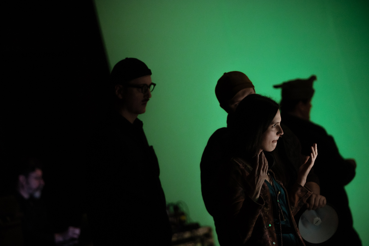 Když diváci vstupují do sálu pražského Vzletu, v němž se má odehrát Prokletí, ihned jim dojde, že se stávají součástí ne zcela standardního divadelního organismu – než si vyberou místo k sezení, musí projít okrajem hrací plochy zaplněné rozličnými scénografickými prvky a vidí připravující se členy tvůrčího týmu. Na začátku inscenace je publikum informováno, že bude svědkem a částečně i aktérem natáčení filmu. Proto je také nejrozměrnější a nejexponovanější částí dekorace zelená plocha, takzvané klíčovací plátno: na něm a před ním se během necelých dvou hodin, co tato produkce ve Vzletu trvá, odehraje řada scén.