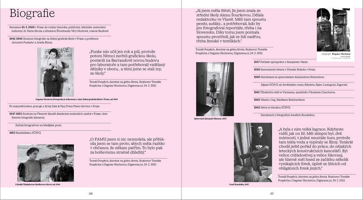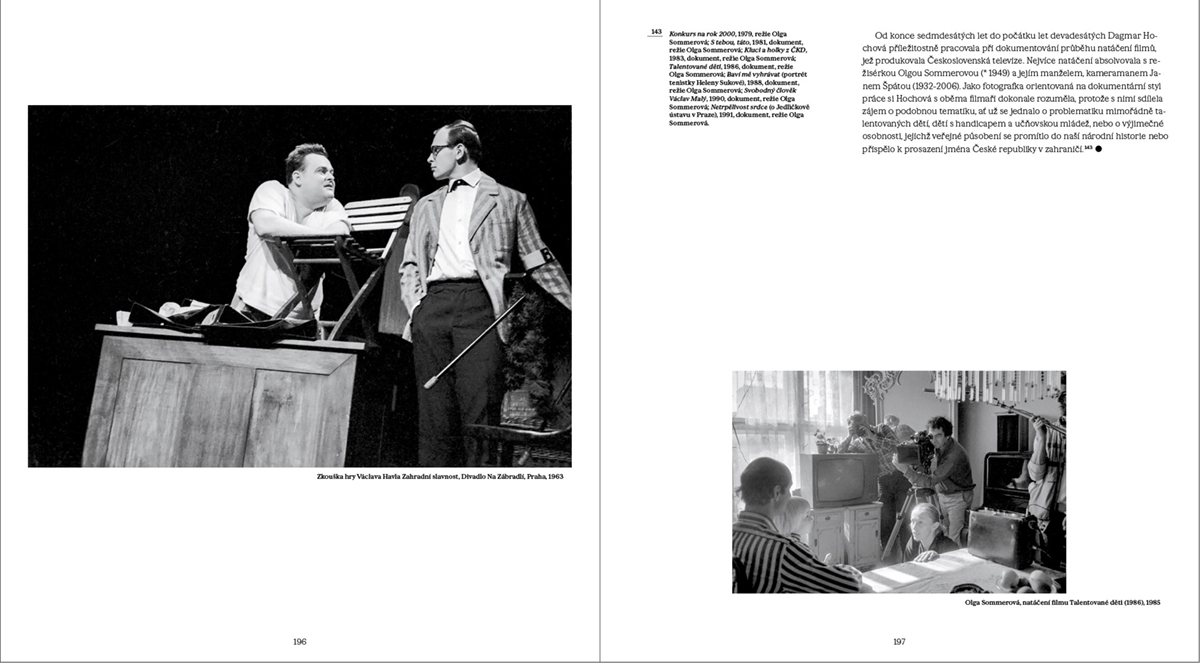 Pohled do monografie Dagmar Hochové vydané Moravskou galerie v Brně a pražským nakladatelstvím PositiF u příležitosti její brněnské a pražské retrospektivy, repro: PositiF „Základní školu s jistými výkyvy překonala,“ formuluje legračně Pátek skutečnost, že Hochová nebyla premiantkou a studijním typem. // Když pisatel přibližuje film Vesnická dopisovatelka, u něhož byla studentka FAMU Hochová kameramankou, poznamenává, že snímek má natolik dynamický střih, že udrží i „pozornost diváka dvacátého prvního století, který vyrostl v prostředí, v němž má veškerá komunikace povahu klipu“. Vzhledem k ambicím projektu, jimiž se Pátek netají, je to nejapné zobecnění. // Badatel připomíná edici Umělecká fotografie vycházející v nakladatelství Odeon od konce padesátých do osmdesátých let a tvrdí, že její svazky se v „důsledku staly stavebními kameny pro sestavení kanonické historie naší umělecké fotografie“. Realitou je, že dosud žádné ucelené dějiny české fotografie sestaveny nebyly, žádné nevyšly, natož pak kanonické. // „Fotografové, grafičtí designéři a publicisté se na přelomu padesátých a šedesátých let stali prostředníky moderního životního stylu. Společnosti se tehdy vydaly cestou permanentní růstu a fotografie jim v jejich úsilí vydatně pomáhala,“ zní dalších ze silně problematických pasáží; vývoj v šedesátých letech i v následujících dekádách byl v globálnějším náhledu rozhodně krkolomnější, než aby se to vše dalo spláchnout souslovím „permanentní růst“.