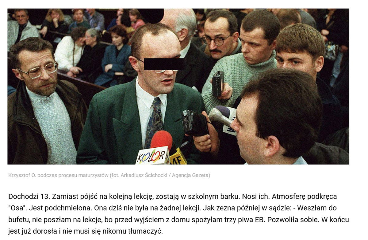 Monika Osińska na místě činu, při rekonstrukci vraždy dvaadvacetileté Jolanty Brzozowské. Rekonstrukce se konala měsíc poté, co k činu došlo. Screenshotový výřez z materiálu polského média Gazeta Żoliborza, repro: ČT art