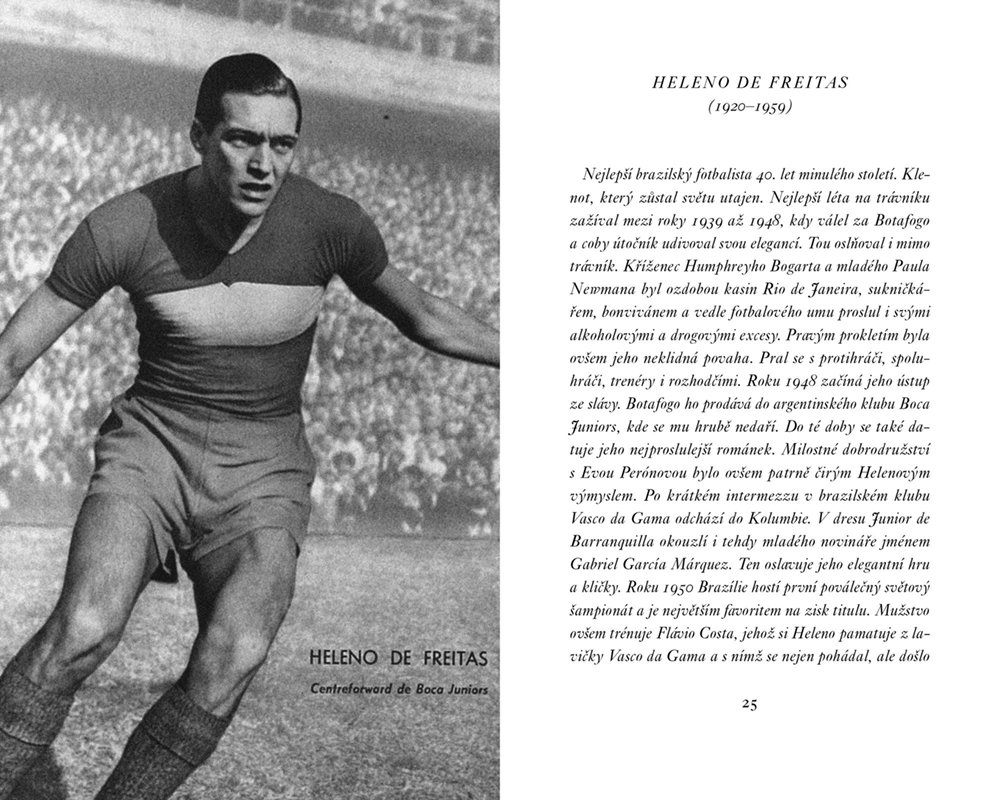 Petr Šmíd svět každého z těch čtyř načrtává drobným mystifikujícím příběhem – ironickým, ne však zlomyslným, ve výsledku vlastně především melancholickým a soucitným. U de Freitase zvolil monolog v ich-formě. Běží o vzpomínku nyní osmatřicetiletého fotbalového vysloužilce, jenž ovšem vyhlíží již jako stařec, na jeden zlomový životní okamžik. U zbylých autor použil er-formu. Canhoteiro bloudí předměstím a snaží se splašit drobáky na levný chlast, když vtom na zemi zahlédne medailonek s podobenkou krásné černošky a nápisem Rosa Egipcíaca. Šmíd rozvine ženin příběh, a pak vyprávění vrátí ke kolabujícímu, ze světa odcházejícímu Canhoteirovi. Garrincha jej inspiroval k asi nejbláznivějšímu ze čtyř příběhů: někdejší fotbalová hvězda je alkoholikem, který se za sklenky cachaçy (brazilská obdoba rumu) nechá naverbovat do bizarního kšeftíku, který ještě bizarněji skončí. A konečně trenér Flávio Costa: chodí po setmění po břehu moře, snaží se koncentrovat před výše zmíněným mistrovstvím světa, pak na pláži potká vysokou štíhlou dívku, a jejich setkání Šmíd dofabuluje do mystické koncovky. Za každý z těch minipříběhů autor připojil kurzívou vysázený faktografický profil daného fotbalisty. Kromě toho jsou texty ilustrovány jednak snímky protagonistů, jednak vtipně vybranými žánrovými fotkami mladých atraktivních žen z oněch dob či záběry jihoamerické krajiny.