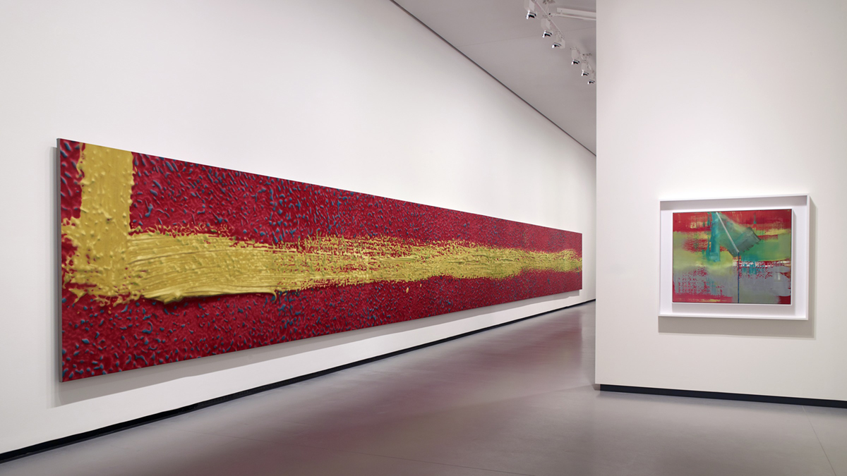 Pohled do výstavy Gerharda Richtera v pařížské Fondation Louis Vuitton. Vlevo olej na plátně z roku 1980 Strich (auf Rot), rozměry 190 x 500 cm, foto: Fondation Louis Vuitton – Marc Domage Protože Richterova tvorba je mimořádně stylově členitá, po návštěvě si divák může připadat, jako by zhlédl expozici sestavenou z děl několika tvůrců. Retrospektiva, kterou kurátorsky sestavili Dieter Schwarz a Nicholas Serota, je pojata víceméně chronologicky. Na jejím začátku jsou jedny z nejslavnějších Richterových obrazů, které vznikly svérázným přemalováním fotografií – je mezi nimi samozřejmě i Onkel Rudi, portrét rozesmátého umělcova strýce v nacistické uniformě, který byl na výstavu zapůjčen ze sbírky lidického památníku. Válečnou minulost ostatně Richter tematizuje opakovaně. Nechybí ani další slavné dílo, akt malířovy ženy Emy kráčející ze schodů.
